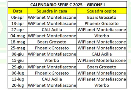 Inoltre è stato diffuso dalla Federbaseball il calendario della serie C, che vede i giallo-verdi inseriti in un girone a 5 squadre con partite di andata, ritorno e andata, dal 6 aprile al 20 luglio. La Federbaseball ha suddiviso le 77 squadre della serie C nazionale in 12 gironi, con l’obiettivo di ridurre le distanze delle trasferte. Il Wiplanet Montefiascone è stato inserito nel girone I, con due squadre di Grosseto, i Boars e i Phoenix, rispettivamente società nell’orbita di BSC e BBC Grosseto, oltre a Viterbo e CALI Acilia; l’esordio sarà in casa contro i Boars Grosseto, poi Phoenix Grosseto, CALI Roma e Viterbo.