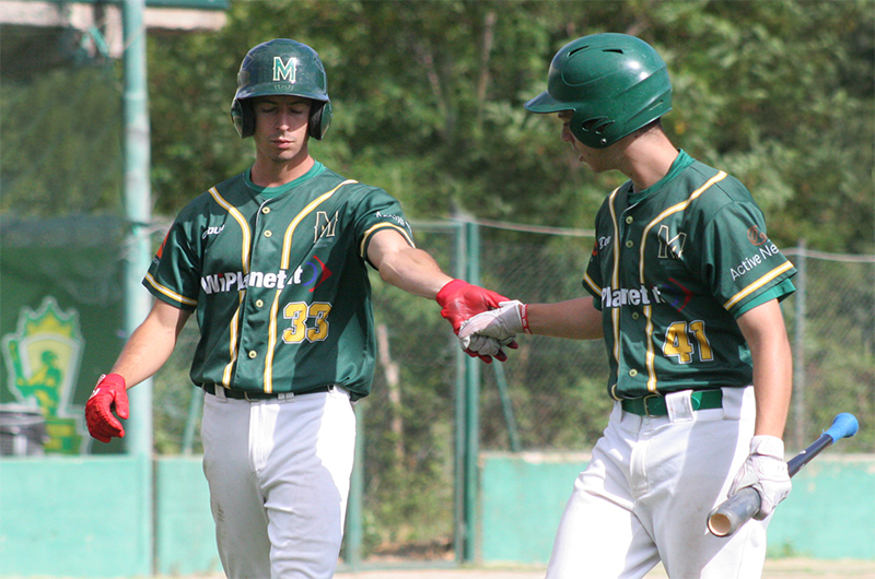 Una grande soddisfazione aleggiava domenica pomeriggio nello spogliatoio del WiPlanet Montefiascone Baseball, crescendo poi in casa del presidente-lanciatore Cristiano Tabarrini, autore di una splendida prestazione sul monte (5 RL, 4 BVC, 5BB, 5K), assecondato dal figlio Andrea (nella foto cover con Matteo Carletti) , che si è adattato a giocare ricevitore per gli infortuni dei due titolari Aprile e Merlini, disputando 9 inning ad alto livello, con la ciliegina di un colto rubando, e dal secondo figlio Giuseppe, autore di un triplo e ottime prese al volo all’esterno. Era già successo con la famiglia Carletti qualche anno fa, con babbo Pietro in 1B, Matteo interbase e Michele lanciatore. La passione di queste due famiglie è un esempio e siamo certi che ha contribuito decisamente alla splendida prestazione della squadra giallo-verde.
