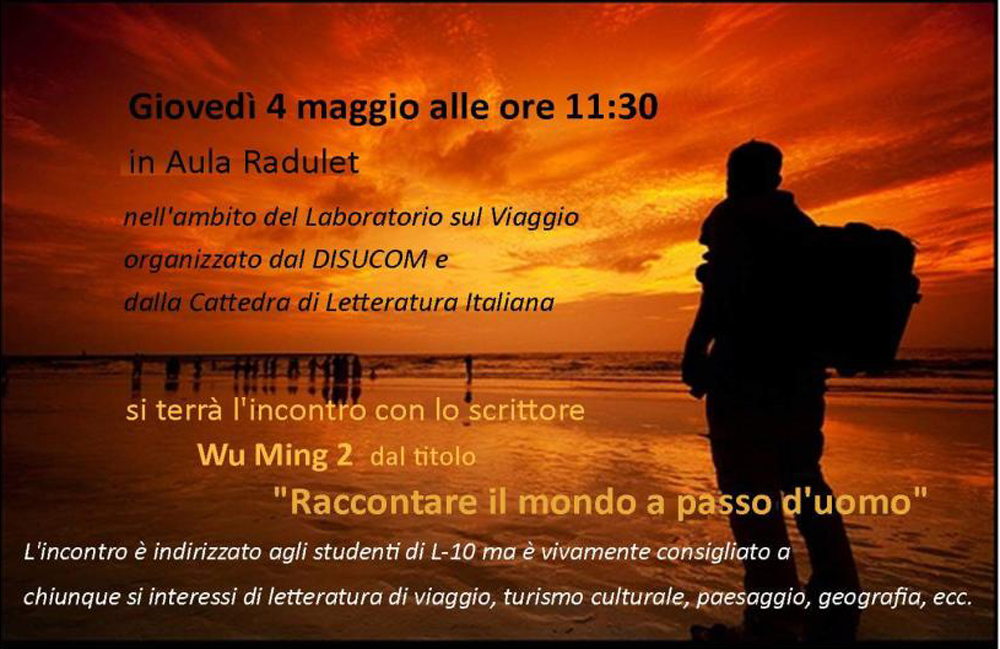 Giovedì 4 maggio alle ore 11:30 in Aula Radulet di Unitus, nell’ambito del Laboratorio sul Viaggio organizzato dal Disucom e dalla Cattedra di Letteratura Italiana, si terrà l’incontro con lo scrittore Wu Ming 2 dal titolo “Raccontare il mondo a passo d’uomo”.